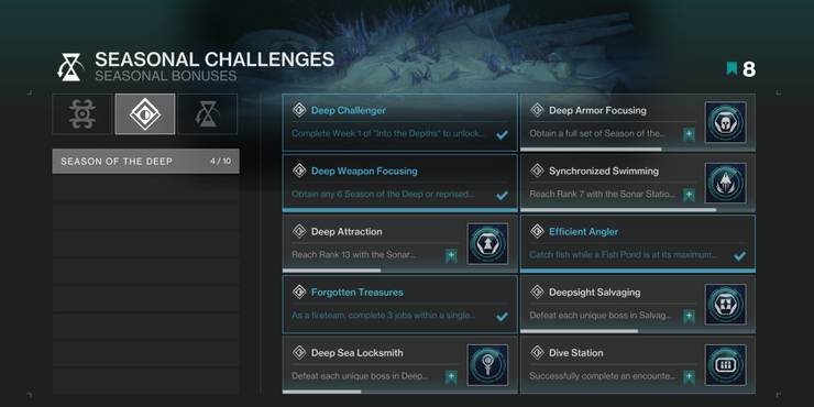 Deep Challenger's reward gives the Salvage and Deep Dive weekly challenges a chance to drop a Deep Engram. Challenges in this case refer to the weekly Powerful and Pinnacle Gear sources tied to both activities. Since this is a seasonal Engram type, the Engram will be sent to the Sonar Station vendor at the H.E.L.M. for later decryption. This reward only applies to weekly gear sources.